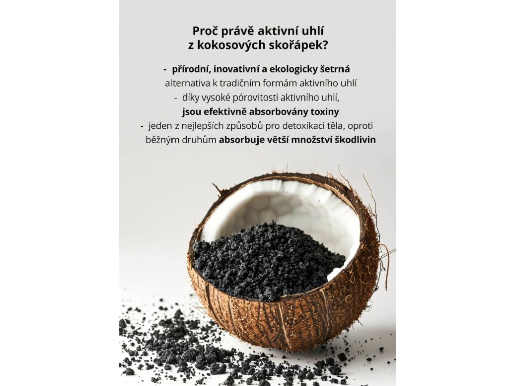 - obsahuje 600 mg aktivního uhlí ze skořápek kokosových ořechů