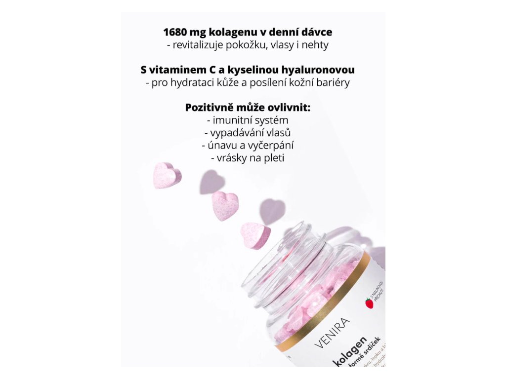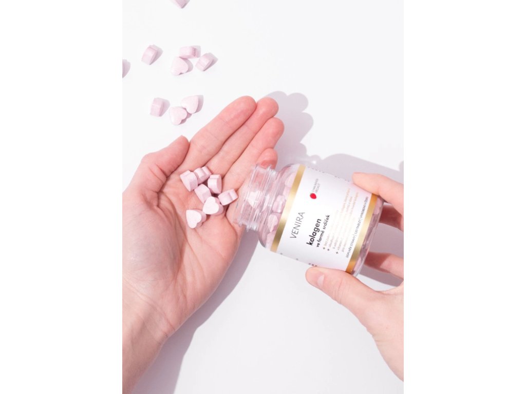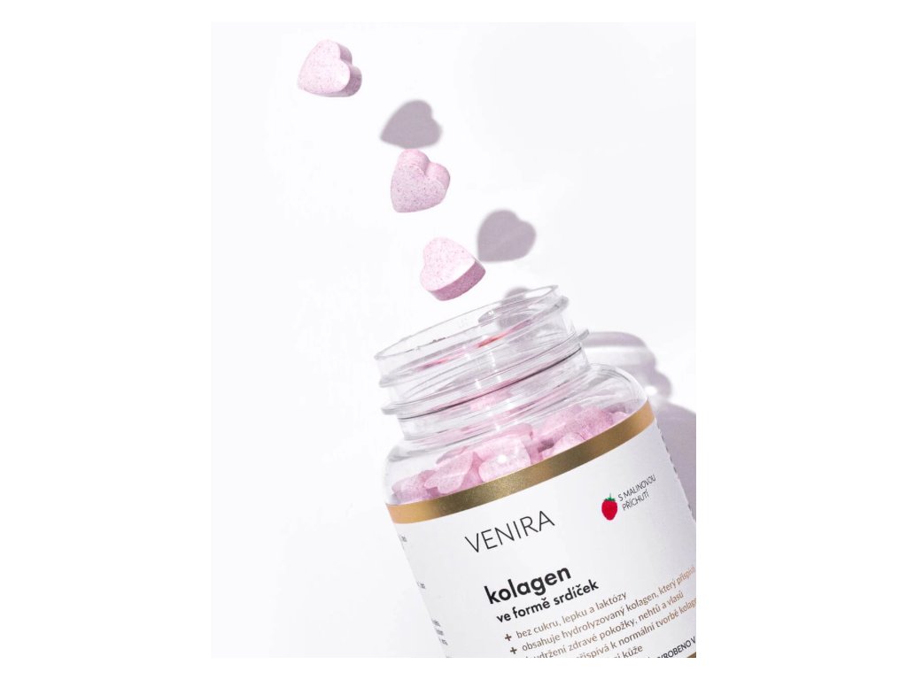 Pravidelným užíváním VENIRA kolagenu ve formě srdíček příznivě podpoříte stav své pleti, vlasů i nehtů.